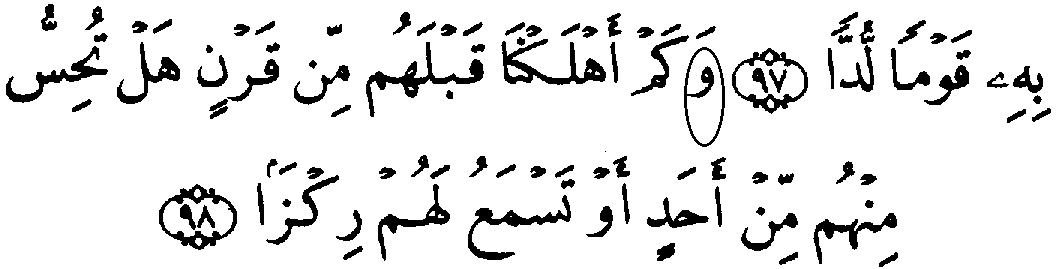 - முதல் வரியில் 'மூல' குர்‍ஆனில் 19:98ம் வசனத்தில் "மீன் அலீஃப்" என்ற எழுத்துக்கள் காணப்படுகிறது (இவைகள் ஃப அல்லது காப் என்ற எழுத்தாகவும் இருக்கலாம்). ஆனால் தற்கால குர்‍ஆனில் "வாவ்" என்ற எழுத்து காணப்படுகிறது.