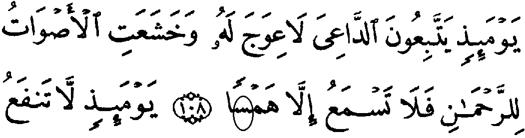 - முதல் வரியில் 'மூல' குர்‍ஆனில் 20:108ம் வசனத்தில் "ஸீன்" என்ற எழுத்து காணப்படவில்லை. ஆனால் தற்கால குர்‍ஆனில் "ஸீன்" உள்ளது.