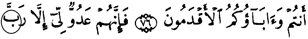 - இரண்டாம் வரியில் 'மூல' குர்‍ஆனில் 26:77ம் வசனத்தில் "" என்ற எழுத்து உள்ளது, ஆனால், தற்கால குர்‍ஆனில் அவ்வெழுத்து "ப (ba)" என்று காணப்படுகிறது.