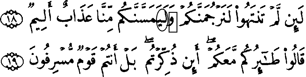 - பன்னிரண்டாம் வரியில் 'மூல' குர்‍ஆனில் 36:18ம் வசனத்தில் "அலீஃப்" எழுத்து காணப்படுகிறது, ஆனால், தற்கால குர்‍ஆனில் "லாம்" மற்றும் "" என்ற எழுத்துக்கள் அவ்வார்த்தையின் அடுத்ததாக சேர்க்கப்பட்டுள்ளது.