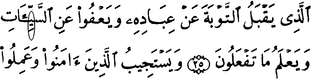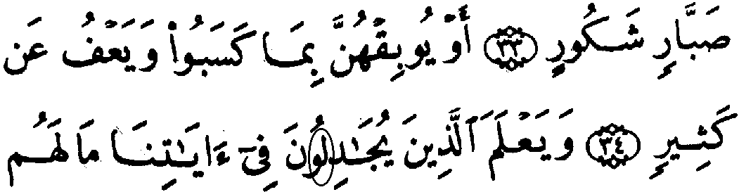 - பன்னிரண்டாம் வரியில் 'மூல' குர்‍ஆனில் 42:35ம் வசனத்தில் "வாவ்" என்ற எழுத்து "லாம்" என்ற எழுத்து இல்லாமல் காணப்படுகிறது, ஆனால், தற்கால குர்‍ஆனில் இரண்டு எழுத்துக்களும் காணப்படுகிறது.