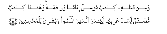 และก่อนหน้านี้ (อัลกุรอาน) มีคัมภีร์ของมูซาเป็นแบบอย่างและความเมตตา