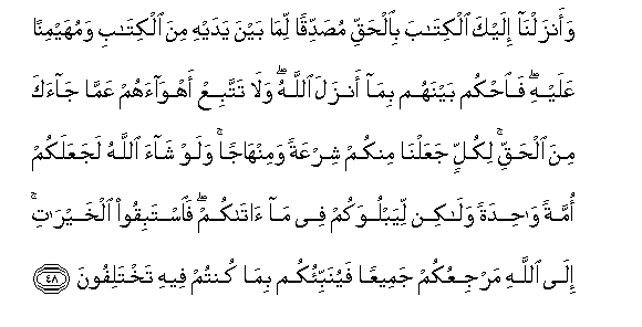 และเราได้ให้คัมภีร์ลงมาแก่เจ้าด้วยความจริงในฐานะเป็นที่ยืนยันคัมภีร์ที่อยู่เบื้องหน้ามันและเป็นที่ควบคุมคัมภีร์(เบื้องหน้า)