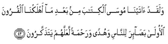 และโดยแน่นอนเราได้ประทานคัมภีร์แก่มูซาหลังจากที่เราได้ทำลายชนชาติในรุ่นก่อนๆเพื่อให้เป็นที่ประจักษ์แจ้งแก่ปวงมนุษย์