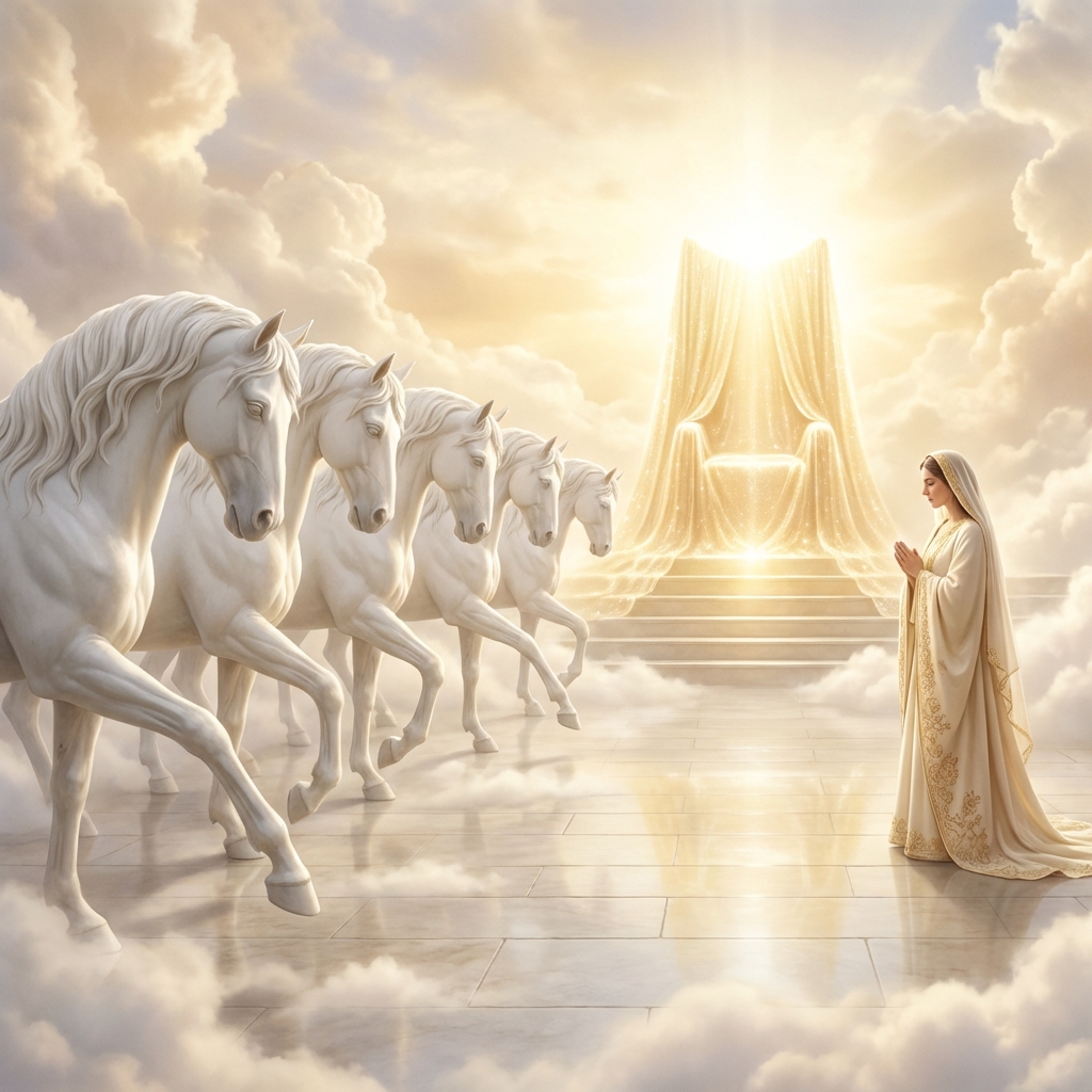 HORSES OF HEAVEN Traveling on with the angel, we passed a place where there were beautiful, white horses. I remembered reading in Revelation about horses and how Jesus will one day be astride a white horse, leading the armies of Heaven, who will also be riding white horses: Now I saw Heaven opened, and behold, a white horse. And He who sat on him was called Faithful and True, and in righteousness He judges and makes war.